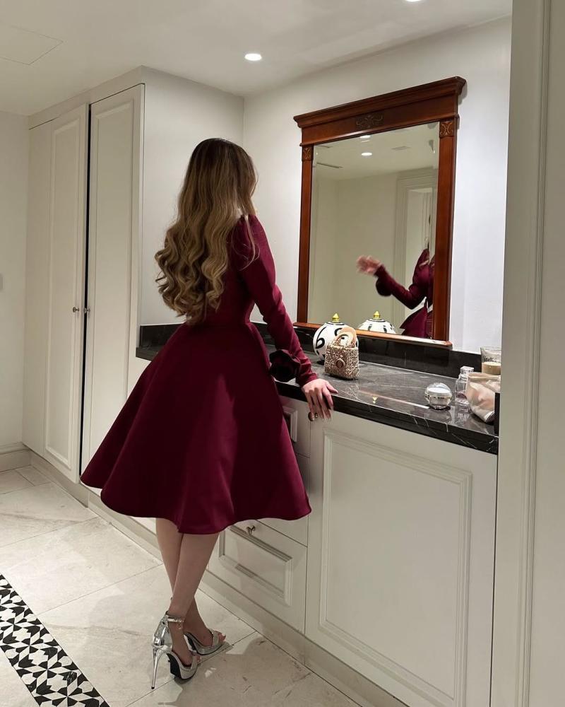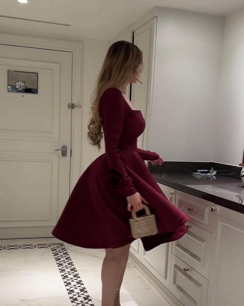 فستان قصير خمري أنيق بأكمام طويلة وقصة ضيقة عند الخصر تتسع تدريجياً نحو الأسفل، مما يضفي عليه لمسة من الرقي والجاذبية. الفستان مصنوع من قماش ناعم ينسدل بشكل جميل، ويبرز أنوثة من ترتديه