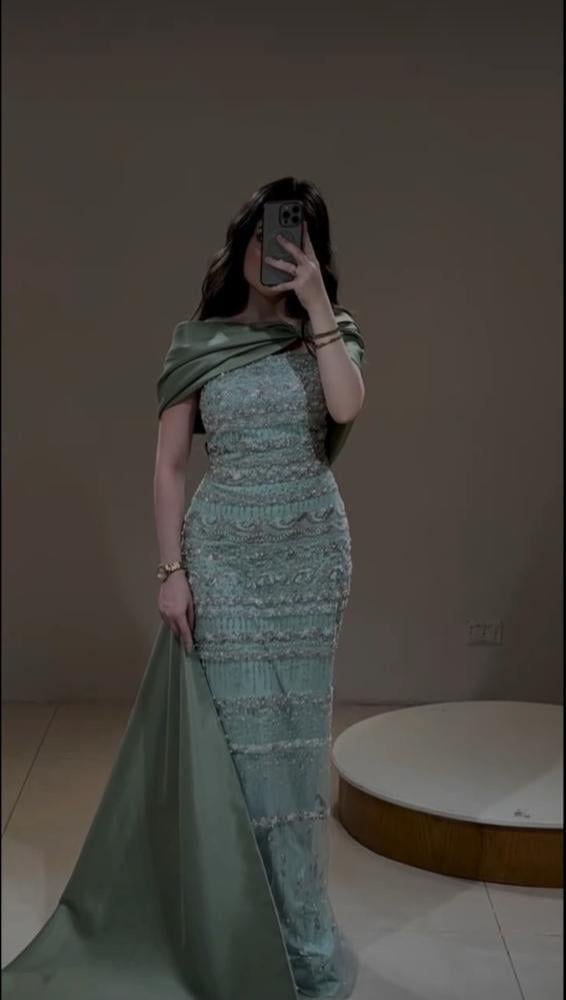 فستان بلون زيتي فاتح بقصة ضيقة تبرز جمال القوام، مزيّن بتطريزات دقيقة بأحجار لامعة تمتد بنقوش أفقية أنيقة على كامل الفستان. يتميز بكاب حريري ينسدل من الكتفين حتى الأرض ليضفي لمسة ملكية ساحرة. الخامة ناعمة وفاخرة، والموديل يليق بذوقك الرفيع ويمنحك حضوراً يليق بك كأميرة في أمسيتك