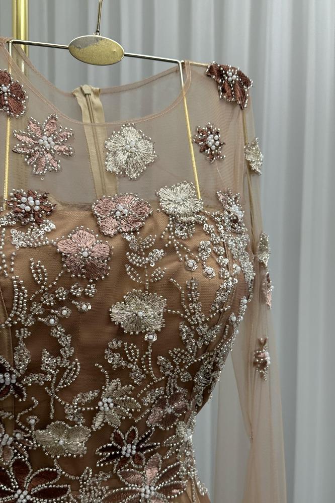 - *الجزء العلوي:* مصنوع من قماش شفاف بلون البيج الفاتح، مزين بتطريزات زهرية بألوان وردية، بيضاء، وبنية تمتد من الكتفين إلى الخصر، مما يضيف لمسة رومانسية وفنية.