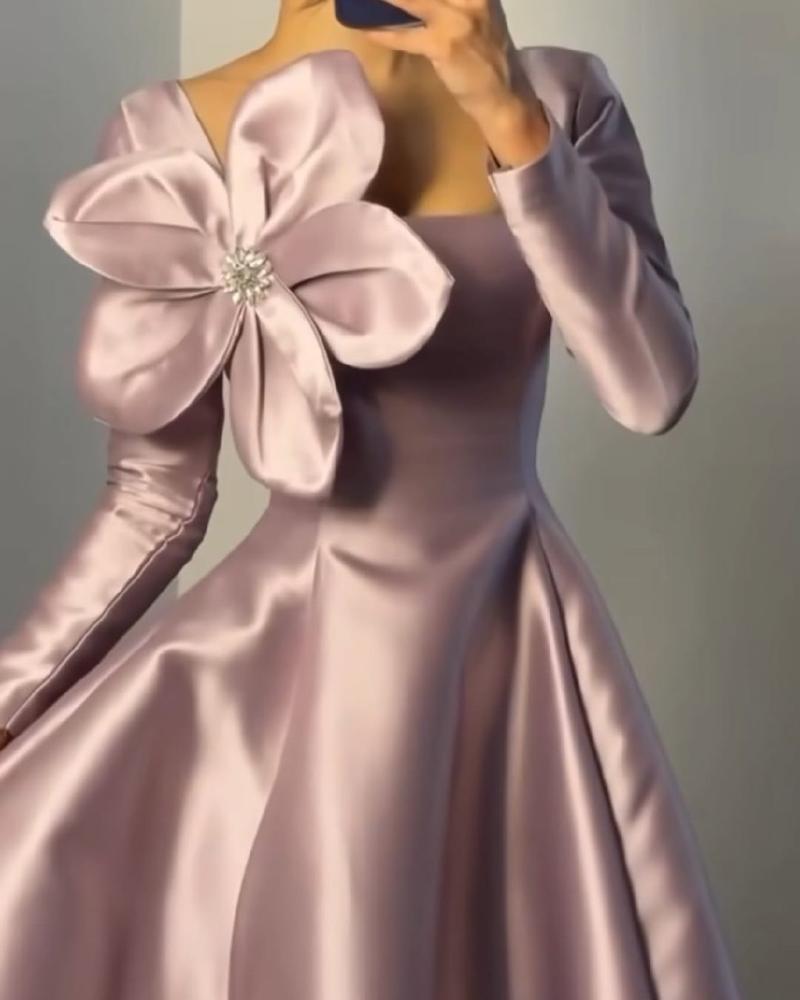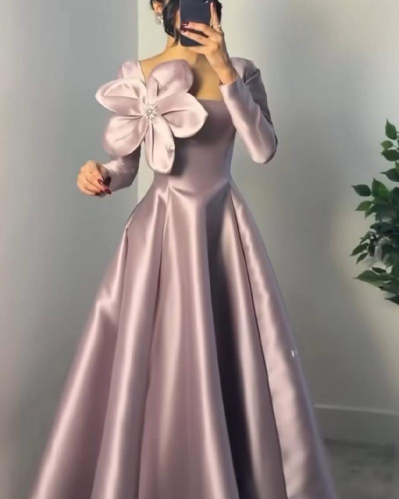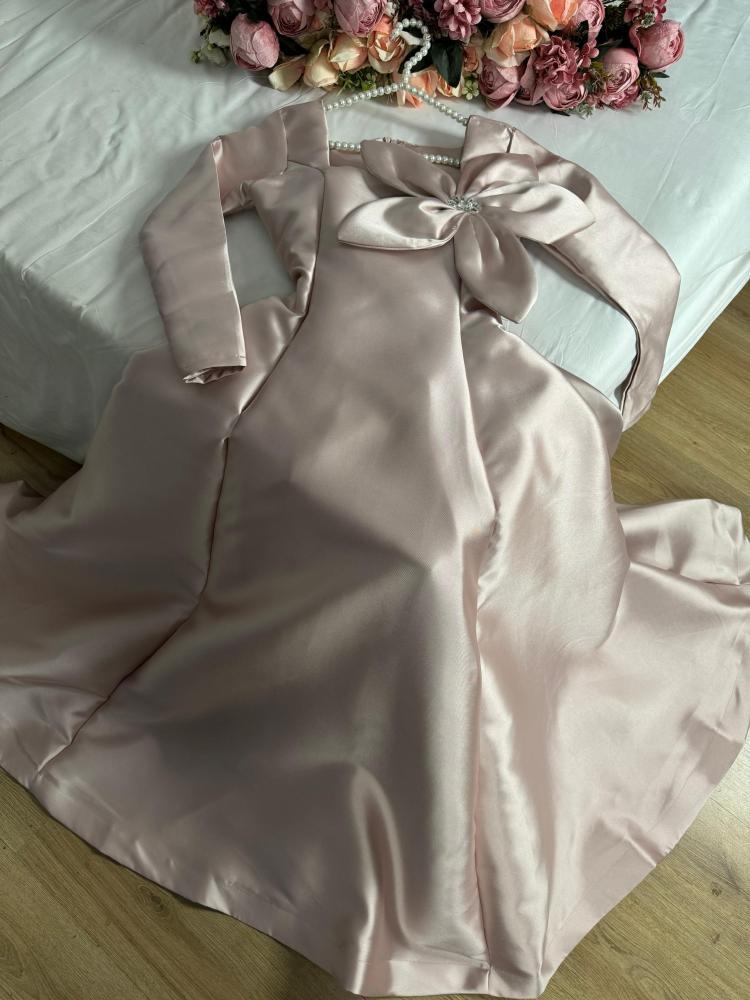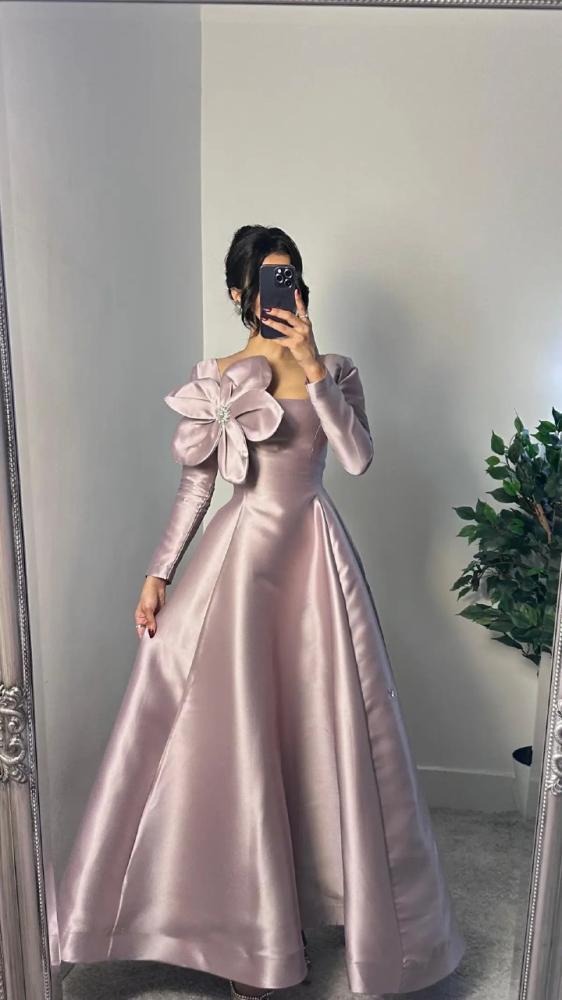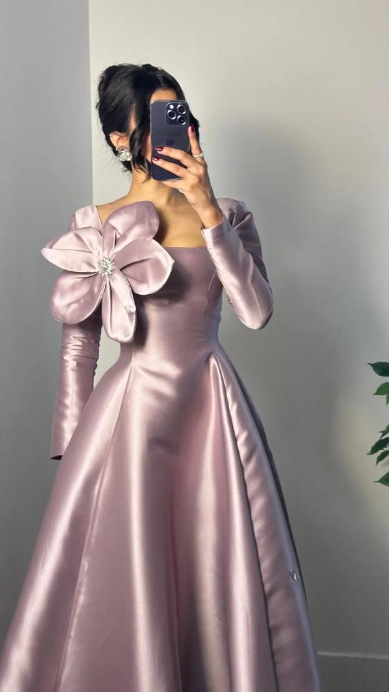 فستان طويل بلون وردي فاتح مصنوع من قماش لامع، يتميز بتصميم أنيق وراقي. الفستان ذو أكمام طويلة ويحتوي على وردة كبيرة على الكتف الأيسر، مما يضفي عليه لمسة من الفخامة والجمال. القصة الواسعة من الأسفل تضيف له رونقاً خاصاً وتجعله مناسباً للمناسبات الرسمية والسهرات