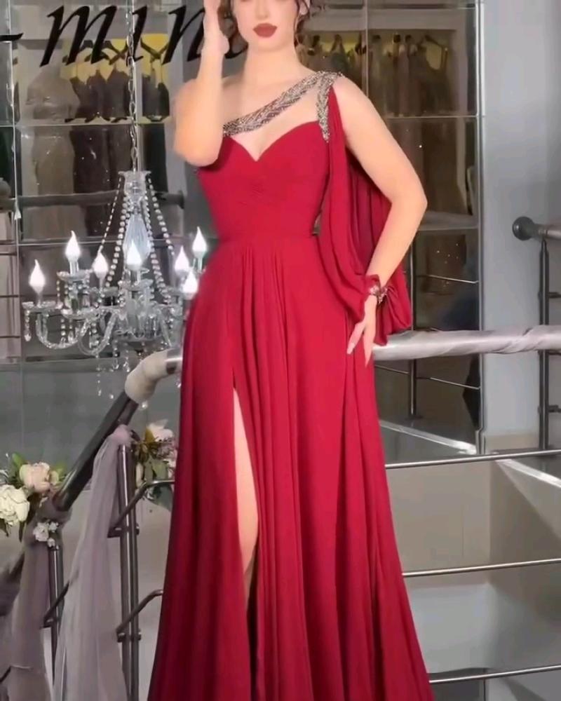 فستان وردي طويل بكتف واحد مزين بتطريز فضي على الكتف والصدر، مع فتحة طويلة من الأمام تكشف الساق. الفستان مصنوع من قماش شيفون ناعم يتدلى بشكل جميل، ويتميز بتصميم أنيق وجذاب يناسب مناسبات الاعراس والزواج والمناسبات الخاصه