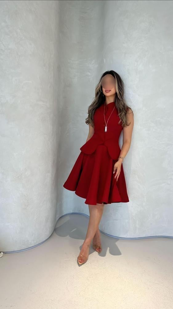 الفستان أحمر اللون، قصير، بدون أكمام، ضيق من الأعلى ويتسع تدريجياً نحو الأسفل، مما يعطيه مظهراً أنيقاً وجذاباً. يتميز بتصميمه العصري والبسيط مع طبقة إضافية على الخصر تضيف لمسة من الأناقة. الفستان مناسب للمناسبات الخاصة ويبرز جمال القوام بشكل رائع